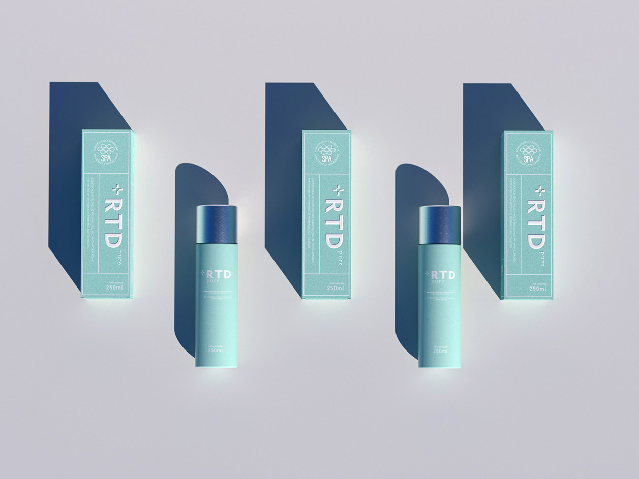 RTD護(hù)膚品的包裝采用了環(huán)保再生紙張,確保包裝對(duì)環(huán)境的影響降到最低。logo采用了浮雕工藝,使得品牌標(biāo)志更具立體感,以簡(jiǎn)潔的線條和獨(dú)特的造型,傳達(dá)出品牌純凈與自然之美。