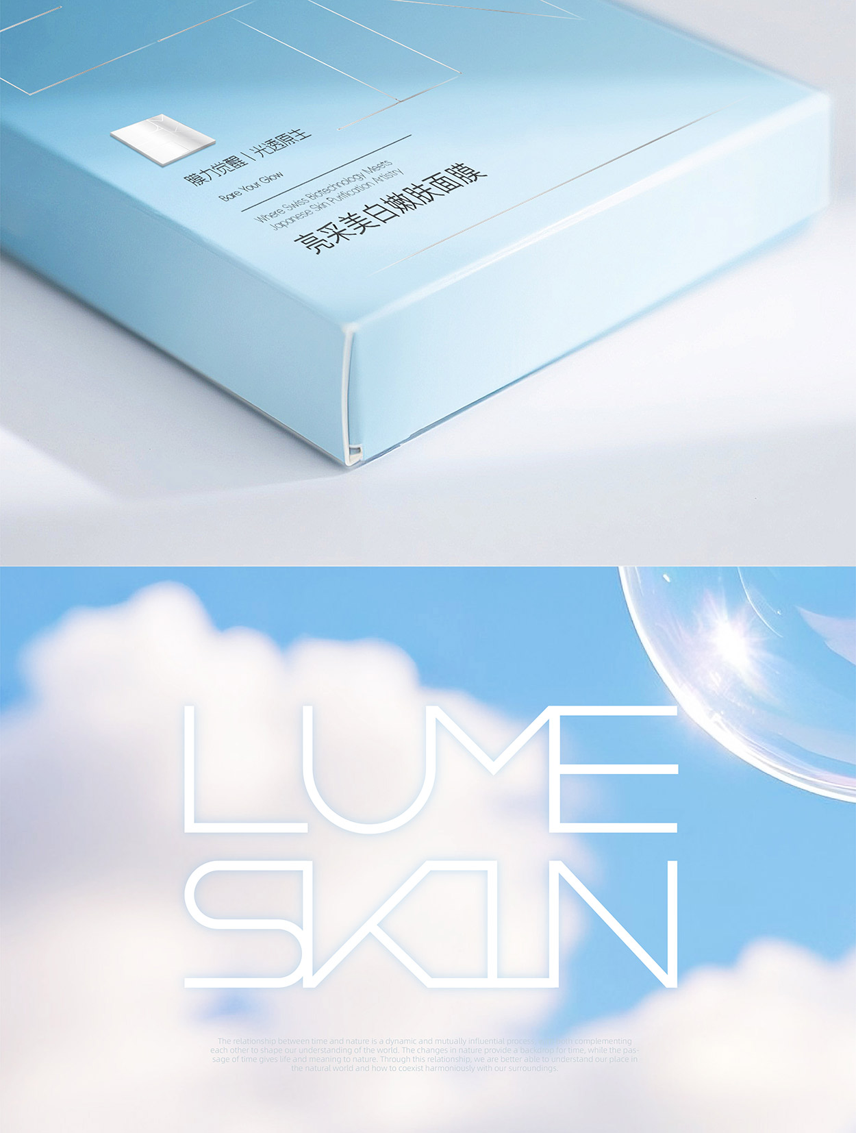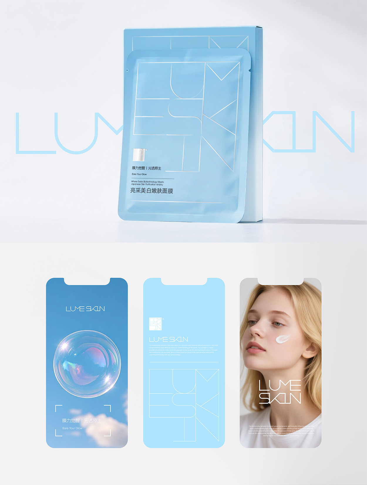 主色選取更接近冰晶、冰川或光暈的淡藍(lán)色調(diào)。它傳遞出純凈、冷靜、科技感和通透感,完美契合“光透”的視覺想象和科學(xué)護(hù)膚的信任感。