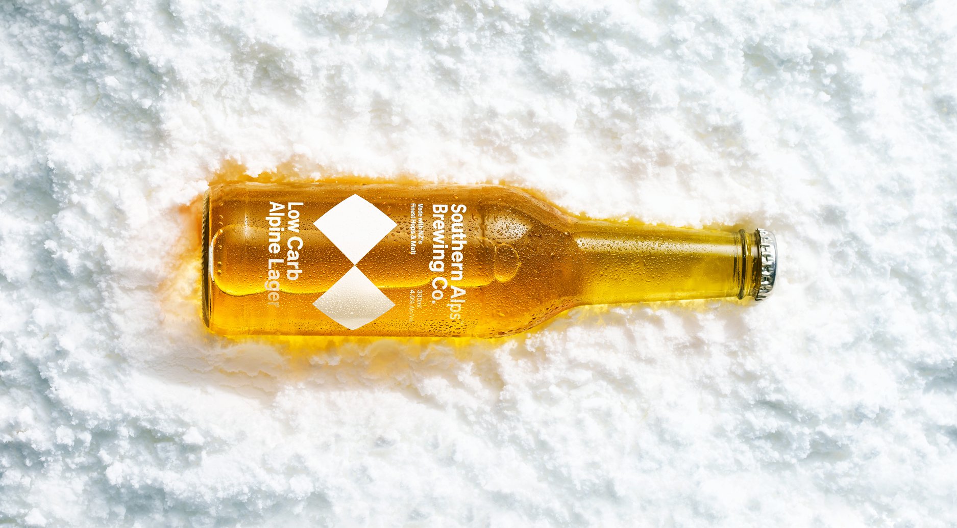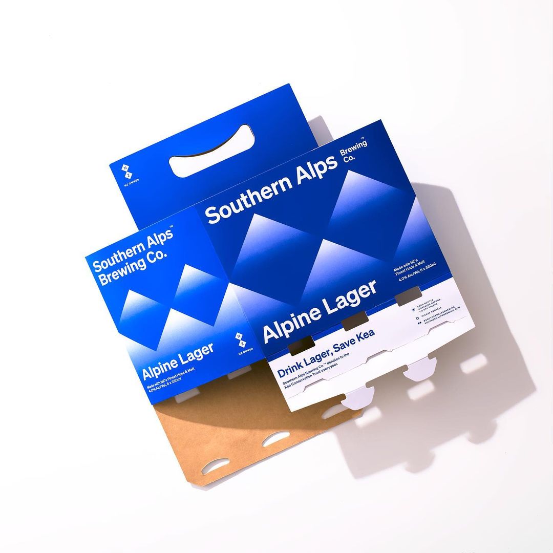 設(shè)計理念以紐西蘭南島滑雪道和冰川山脈的形象作為啤酒品牌視覺設(shè)計,青藍為品牌的主色調(diào),結(jié)合白色漸變和反射,創(chuàng)造出抽象的山脈和冰川景觀。 瓶身以更簡約的標志性形式使用,強調(diào)了清爽的優(yōu)質(zhì)貯藏啤酒,彰顯冒險的精神。