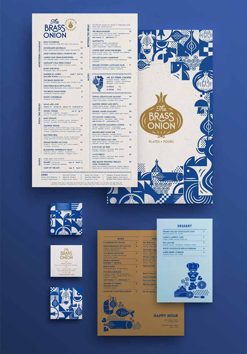 洋蔥作為品牌標(biāo)識的核心元素,其形象在設(shè)計(jì)中反復(fù)出現(xiàn),為整個(gè)視覺系統(tǒng)注入了一抹俏皮的創(chuàng)意。這一圖案不僅融入了各類圖標(biāo)和視覺元素,還啟發(fā)了圖案設(shè)計(jì),靈感源自餐廳內(nèi)引人入勝的馬賽克地磚。從菜單、名片到包裝,這些圖案無處不在,共同營造出一種與用餐體驗(yàn)相得益彰的統(tǒng)一視覺感受。