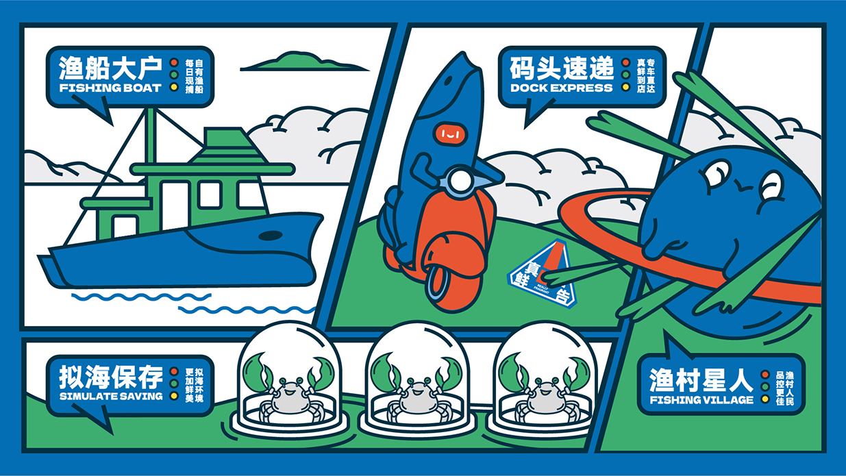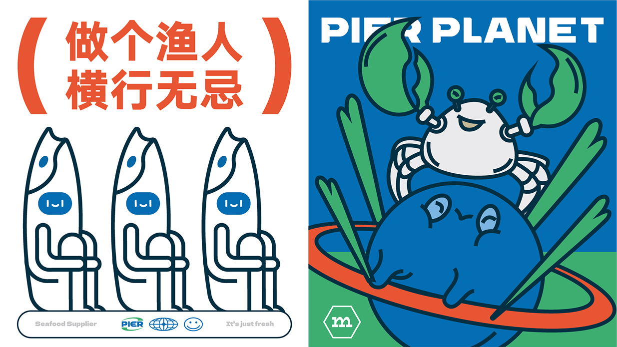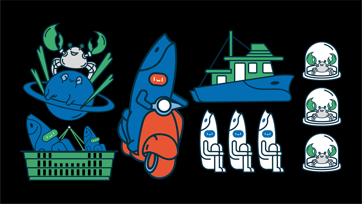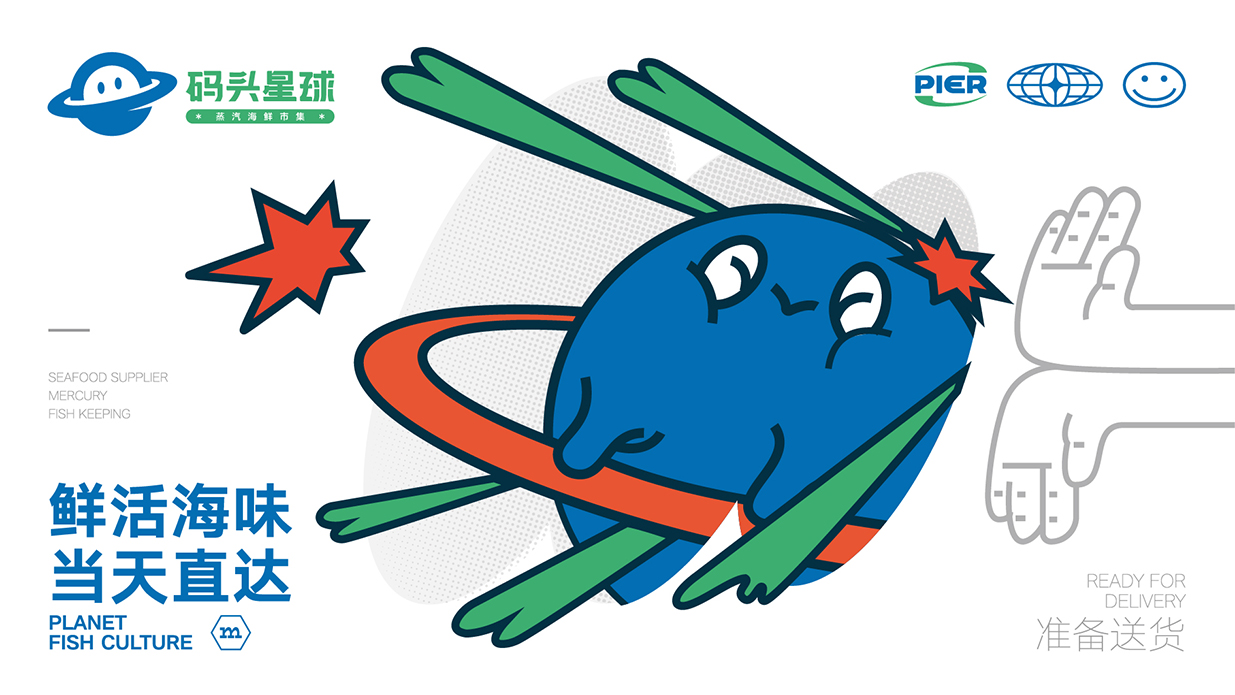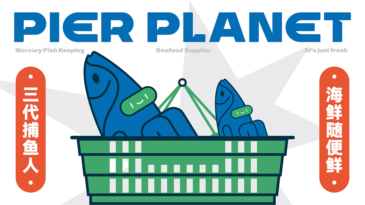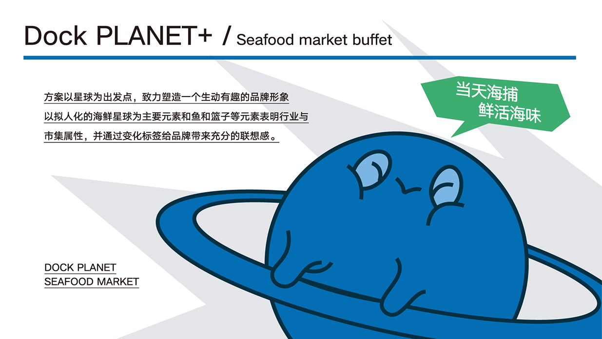 方案以星球?yàn)槌霭l(fā)點(diǎn),致力塑造一個(gè)生動(dòng)有趣的品牌形象以擬人化的海鮮星球?yàn)橹饕睾汪~和籃子等元素表明行業(yè)與市集屬性,并通過變化標(biāo)簽給品牌帶來充分的聯(lián)想感。